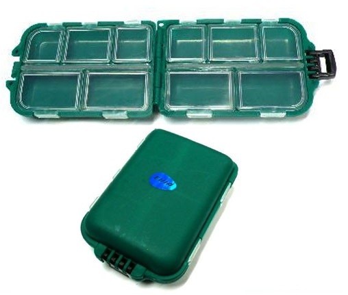 Caja en plástico, perfecta para anzuelos, moscas y pequeños accesorios, con 10 apartamentos de ventanillas y tapa principal. Medidas 90x60x30mm.