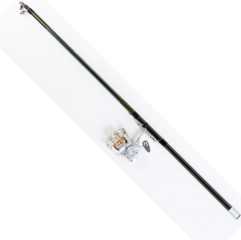 Equipo de pesca compuesto de caña en fibra de carbono composite de 3.80mt telescópica y carrete de freno delantero de 2 rodamientos y bobina de aluminio, acción 10 -30gr.