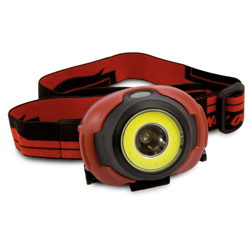 Lámpara frontal LED COB y LED Central 250 lúmenes. 3 modos de luz (Alta/Baja/Luz roja fija) – reclinable a 180°. Funciona con 3 pilas tipo AAA (no incluidas).