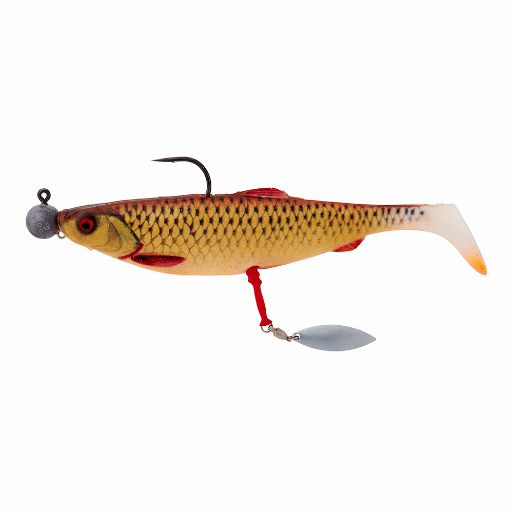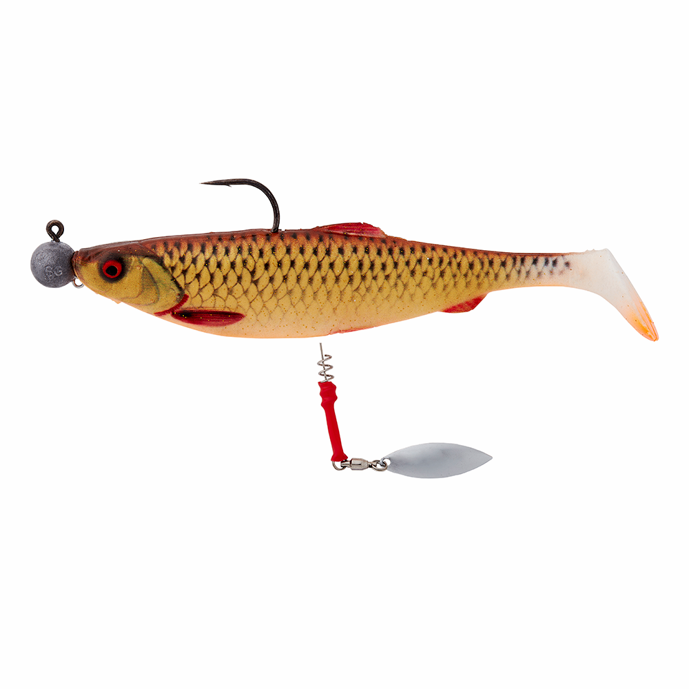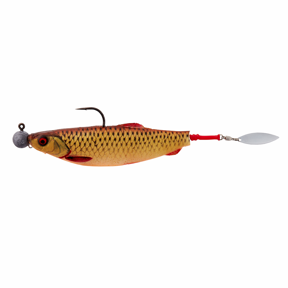Hojas finas de acero plateado, sobre rodamiento a bolas, con un espiral de acero inoxidable, parcialmente reforzado con tubo retráctil rojo fluorescente. ¡Perfecto para añadir un atractivo adicional a tu vinilo, en la barriga, la espalda o la cola!